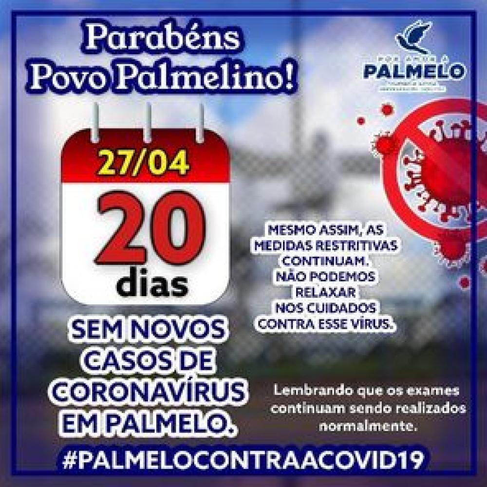 HOJE COMPLETAMOS 20 DIAS SEM REGISTRO DE NOVOS CASOS DE INFECTADOS PELA COVID-19 EM PALMELO.