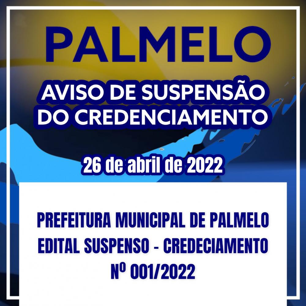 A COMISSÃO PERMANENTE DE LICITAÇÕES DA PREFEITURA MUNICIPAL DE PALMELO - GO, TORNA PÚBLICO PARA O CONHECIMENTO DOS INTERESSADOS A SUSPENSÃO DO CREDENCIAMENTO Nº 001/2022, REFERENTE CREDENCIAMENTO DE PESSOA FÍSICA E/OU JURÍDICA PARA PRESTAR SERVIÇOS NA ÁREA DE SAÚDE; VINCULADO AO PROCESSO ADMINISTRATIVO Nº001/2022 CONSIDERANDO QUE FOI INSTAURADO PROCESSO PARA CREDENCIAMENTO E CONTRATAÇÃO DE UMA ORGANIZAÇÃO DE SOCIEDADE CIVIL PARA GESTÃO DA SAÚDE. AO TEMPO, QUE ESTA COMISSÃO PERMANENTE DE LICITAÇÃO INFORMA QUE A PRÓXIMA DELIBERAÇÃO TORNARÁ PÚBLICO O QUE SE SUCEDERÁ.