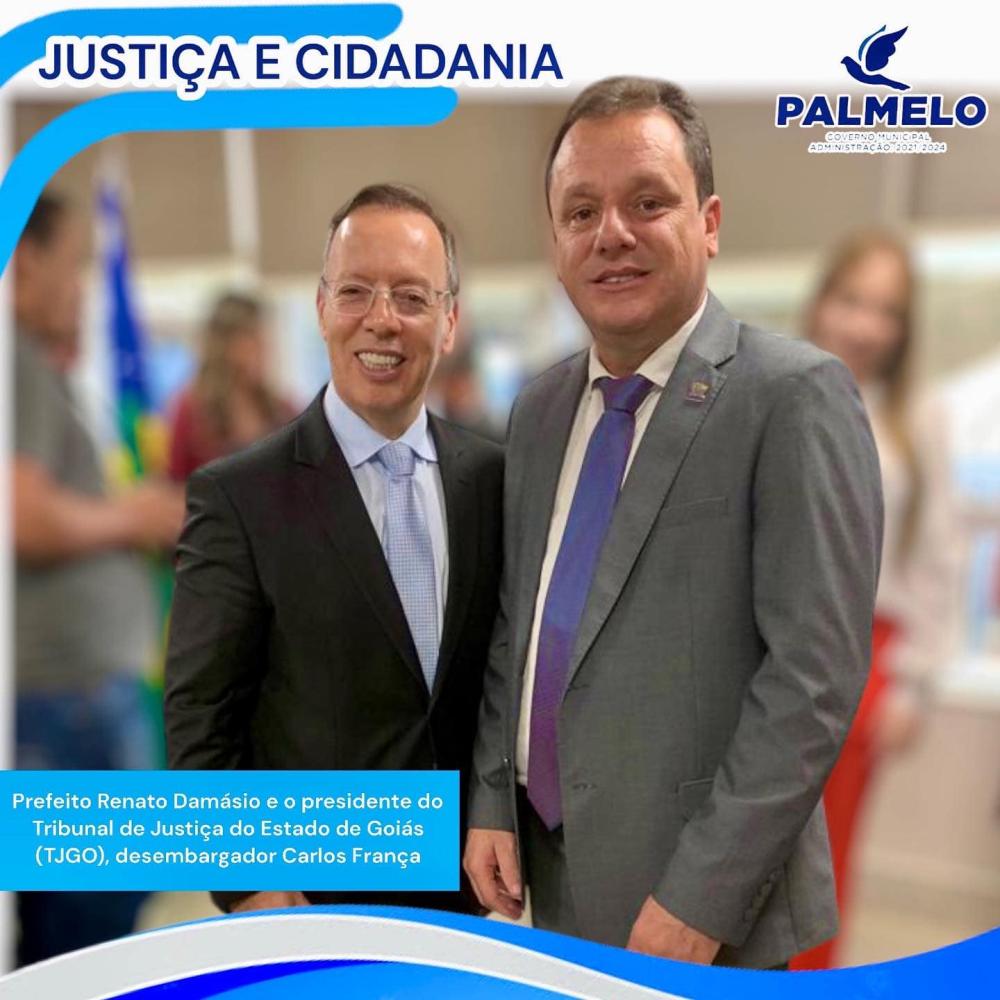 “Prefeito Renato Damásio, em parceria com o Tribunal de Justiça do Estado de Goiás e bem assim com o Tribunal Regional Eleitoral, assinou na tarde de ontem, dia 08/12/22, no Plenário do Tribunal de Justiça de Goiás, Convênio e implantação no Município de Palmelo, o Posto Avançado para todo atendimento judicial e eleitoral para a comunidade palmelina. Trata-se de uma conquista suprema para o Município, pois que, a partir da abertura das instituições judiciais, com a ajuda extraordinária do Juiz de Direito da Comarca de Santa Cruz de Goiás, Dr Nivaldo Mendes Pereira, os palmelinos serão atendidos diretamente na cidade, sem necessidade de deslocamento.