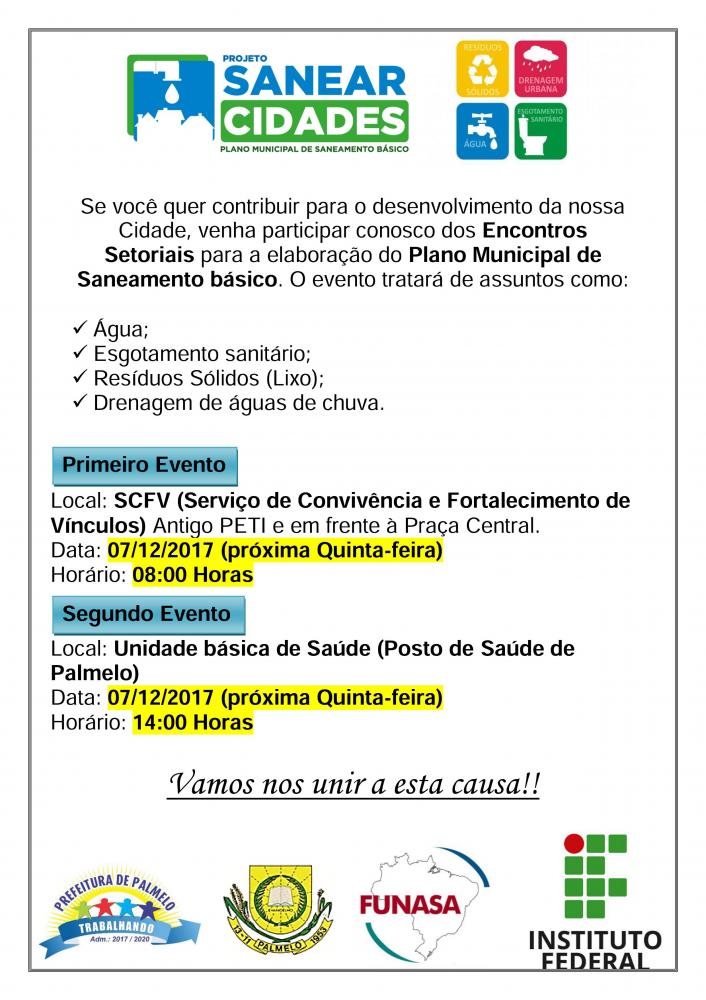 Se você quer contibuir para o desenvolvimento da nossa Cidade, venha participar conosco dos Encontros Setoriais para a elaboração do Plano Municipal de Saneamento básico. O evento tratará de assuntos como: