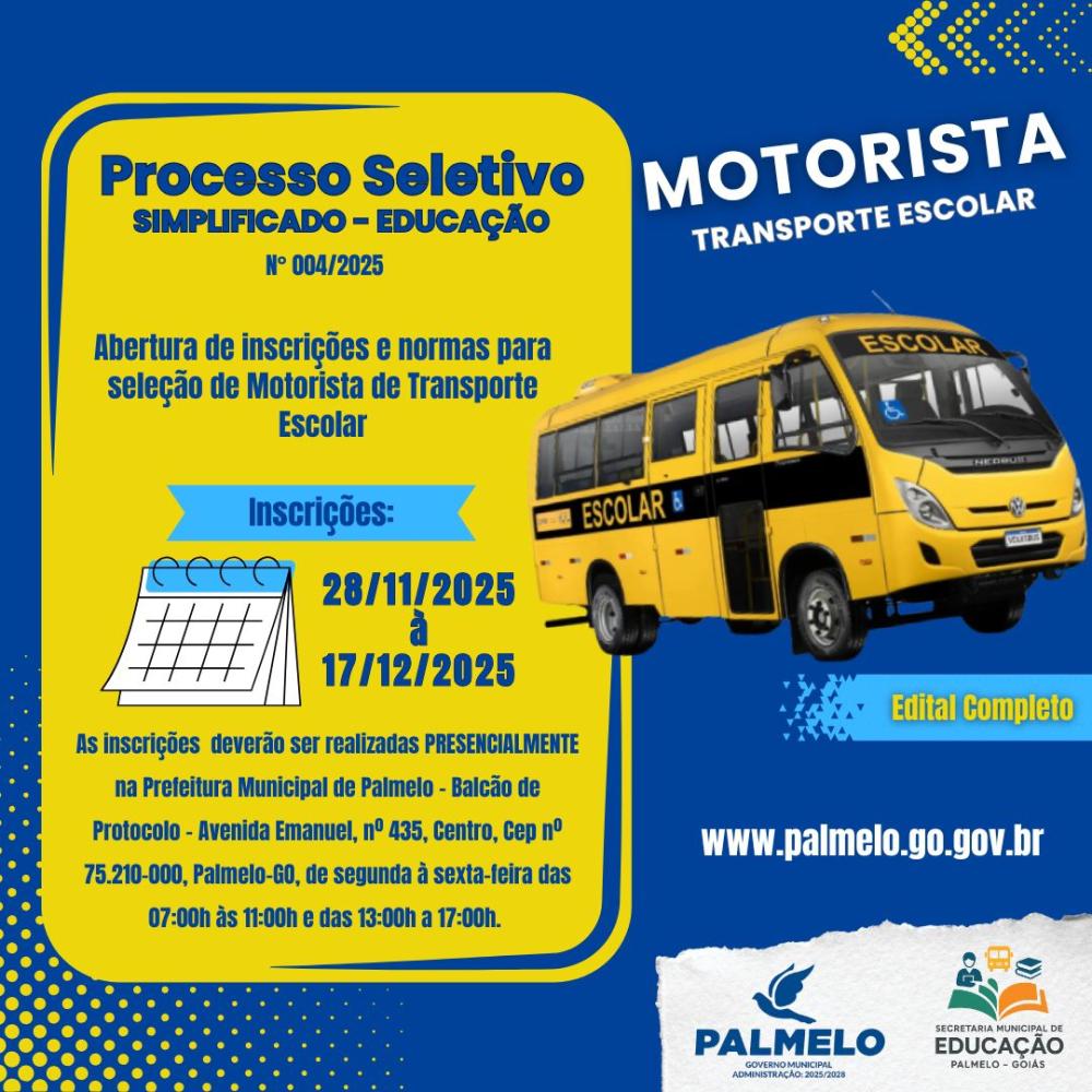 O MUNICÍPIO de PALMELO, Estado de Goiás, por intermédio da SECRETARIA MUNICIPAL DE EDUCAÇÃO, por meio de sua secretária, o Senhor JEAN CARLO G. COUTINHO, designada pelo Decreto 293/2025, de 29 de setembro de 2025, TORNA PÚBLICO, para conhecimento dos interessados que, nos termos Lei Municipal n. 450/2025, de 19 de setembro de 2025, realizará o PROCESSO SELETIVO SIMPLIFICADO Nº 004/2025, com a finalidade de selecionar pessoal para fins de contratação temporária no cargo de MOTORISTA - TRANSPORTE ESCOLAR, para atuação na área da educação, atendendo às necessidades da Secretaria Municipal de Educação. As inscrições ocorrerão no período de 28/11/2025 a 17/12/2025, e deverão ser realizadas PRESENCIALMENTE na Prefeitura Municipal de Palmelo - Balcão de Protocolo – Avenida Emanuel, nº 435, Centro, Cep nº 75.210-000, Palmelo-GO, de segunda à sexta-feira das 07:00h às 11:00h e das 13:00h a 17:00h. O Edital e seus anexos, bem como maiores informações, estarão disponíveis no site