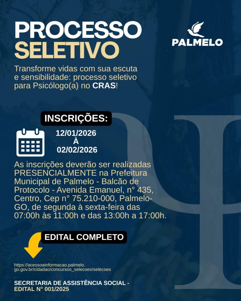 A Prefeitura Municipal de Palmelo, por meio da Secretaria Municipal de Assistência Social, informa a abertura de Processo Seletivo Simplificado para contratação de Psicólogo(a) para atuar no CRAS.
