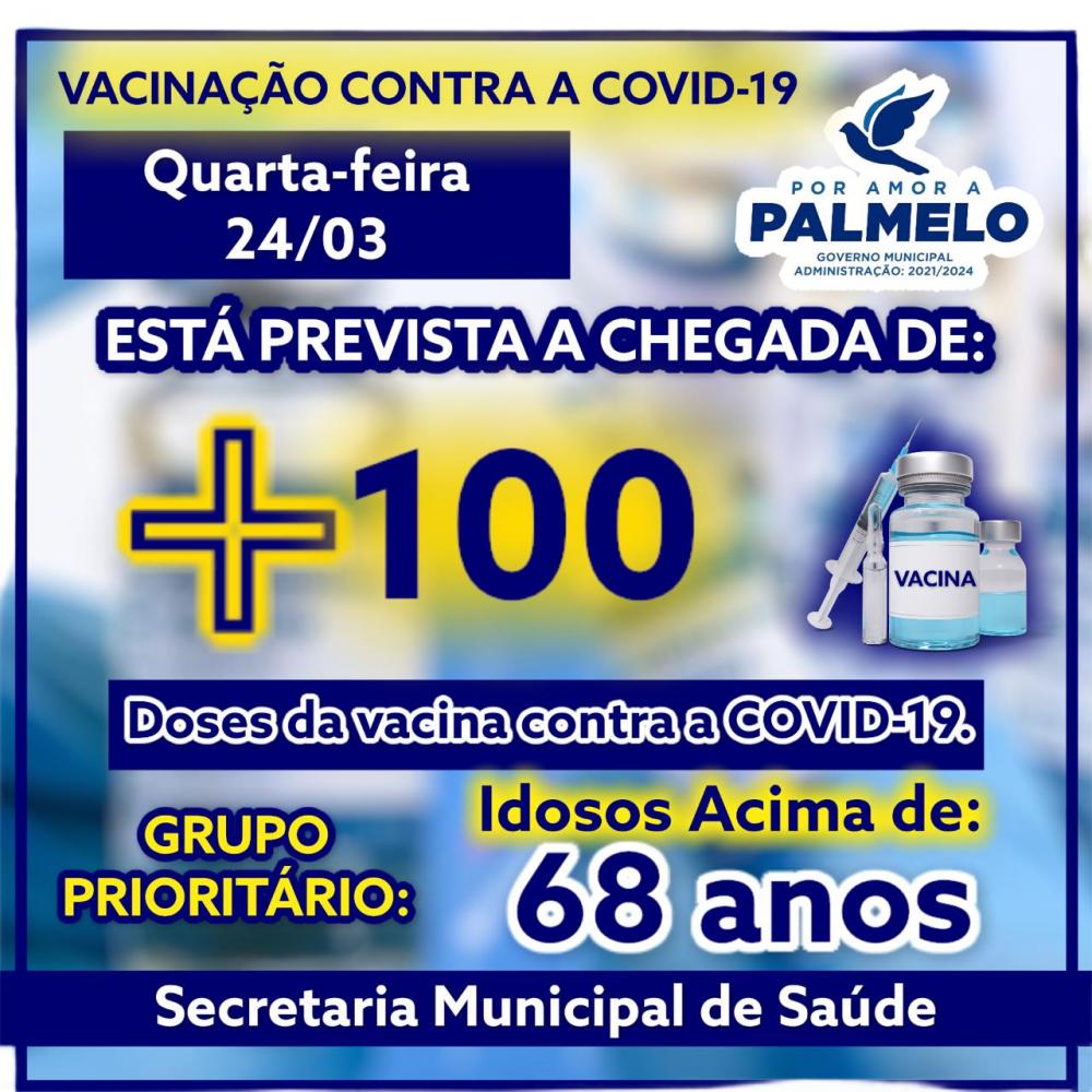 Está prevista a chegada de 100 doses da vacina contra a covid-19 para o municipio de Palmelo, nesta quarta feira 24 de março.