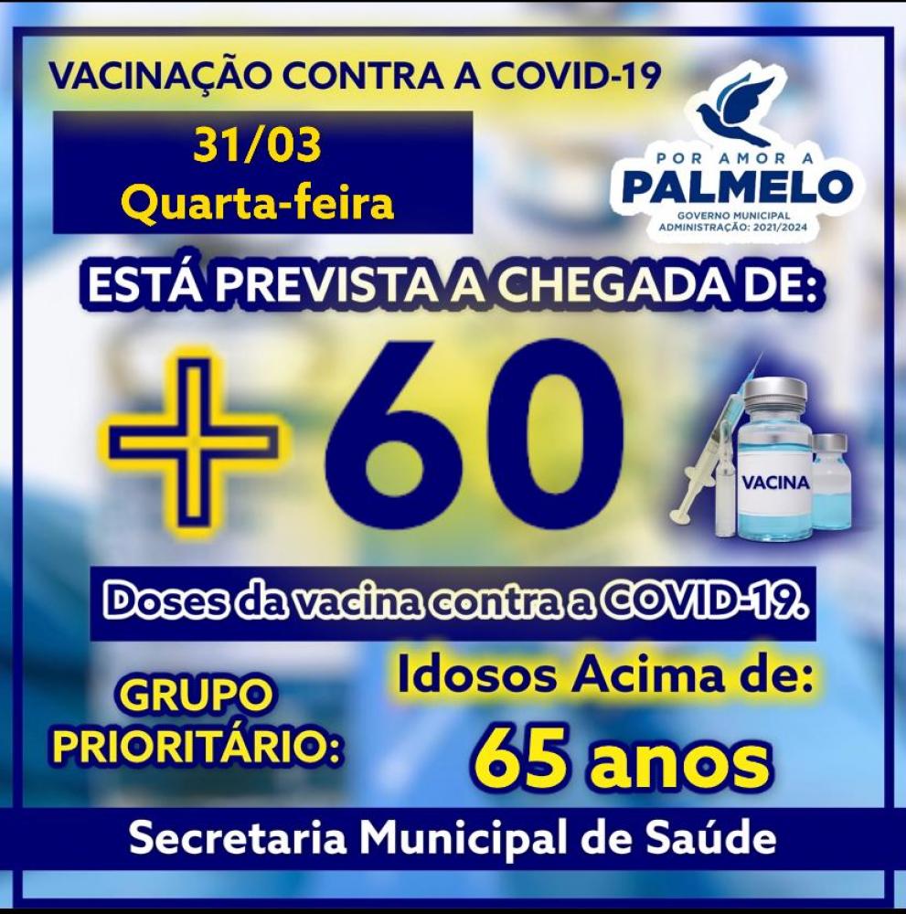 Está prevista para o dia 31 de Março, quarta feira, a chegada de mais 60 doses da Vacina contra a COVID-19 no município de Palmelo.