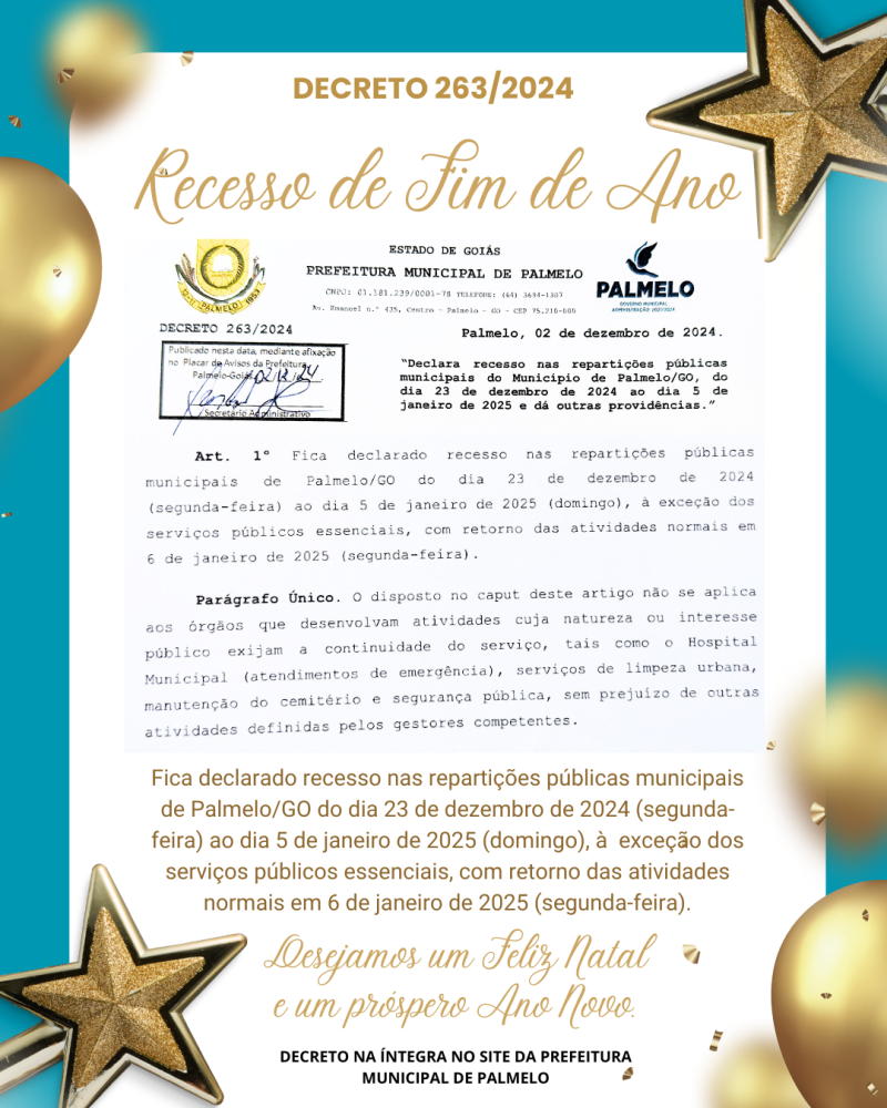 Comunicamos a todos os cidadãos que, conforme o Decreto Municipal 263/2024, haverá recesso administrativo em Palmelo, no período de 23 de dezembro de 2024 a 05 de janeiro de 2025. Durante esse período, as atividades da administração pública estarão suspensas, com exceção dos serviços essenciais, que permanecerão em funcionamento para garantir a continuidade do atendimento à população. Pedimos a compreensão de todos e ressaltamos a importância de planejar suas demandas com antecedência. Para mais informações, consulte o site oficial da Prefeitura.