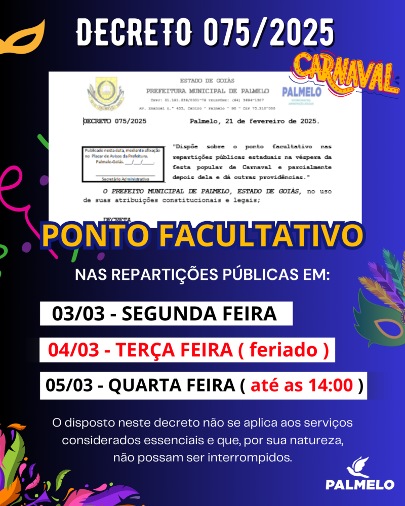 Fica decretado ponto facultatvo nas repartições públicas nos dias 03 de março e 05 de março de 2025, em virtude das festividades carnavalescas. O dia 04 de março é feriado. Ressalta-se que os serviços essenciais, incluindo hospital, limpeza pública e segurança, manterão suas atividades regulares durante este período.