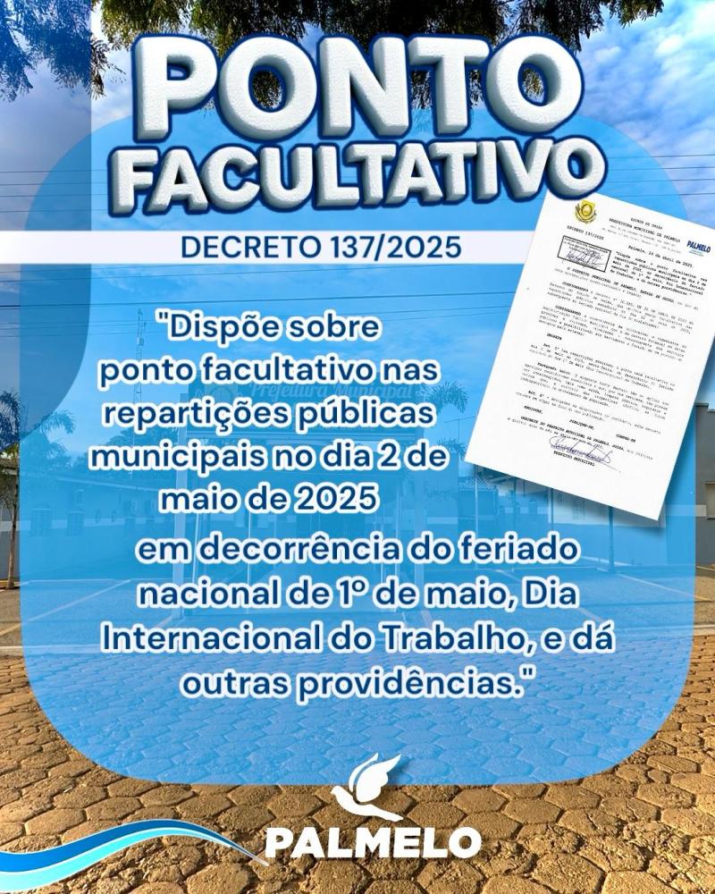 O prefeito Renato, no exercício de suas atribuições, assinou o Decreto nº 137/2025, estabelecendo ponto facultativo nas repartições públicas municipais no dia 2 de maio de 2025 (sexta-feira). Esta medida é em decorrência do feriado nacional de 1º de maio, Dia Internacional do Trabalho.